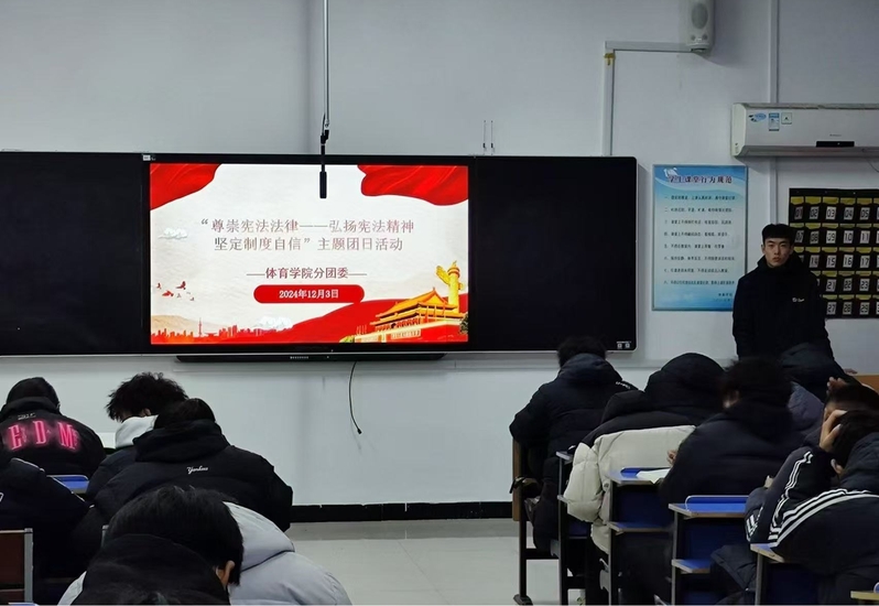 在宪法宣传周的热潮中,体育学院分团委开展“尊崇宪法法律——弘扬宪法精神 坚定制度自信”主题团日活动,积极营造尊法学法守法用法的良好氛围,让法治种子在校园生根发芽。