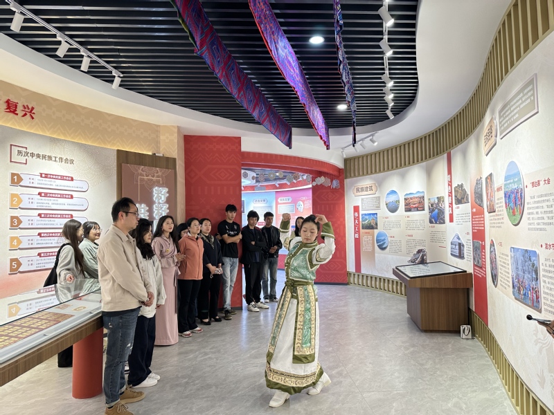 踏入体验馆,师生们仿佛穿越时空,在讲解员的引领下,深入探索各民族多元一体的历史脉络。从古老的民族服饰到传统手工艺品,从独具特色的风俗习惯到辉煌灿烂的文化成就,丰富的展品与生动的场景,全方位展现了各民族相互依存、和衷共济的紧密联系。参观过程中,少数民族学生积极分享本民族文化,蒙古族和藏族的同学表演了民族舞蹈,现场气氛热烈,文化的火花在此激情碰撞。